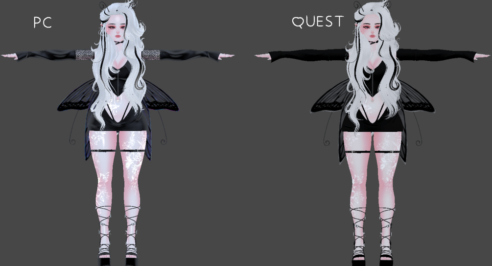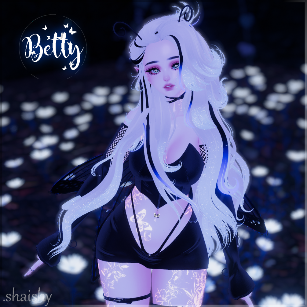 - outfit, choker, garter, gloves, panties, skirt, top, underwear, heels, ring set, butterfly wings, butterfly head, butterfly piercing